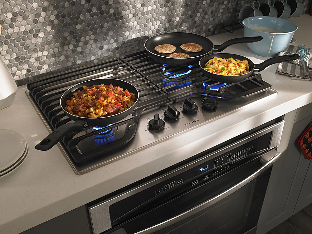 Get a seamless look with this 30-inch Amana(R) Gas Cooktop that installs over your Wall Oven. With 4 Burners providing up to 12,000 BTUs, you can melt, boil and simmer at the same time, and turn up the heat how you like with easily accessible Front Controls. Plus, cleaning is a breeze with Sealed Burners that keep spills from spreading.
